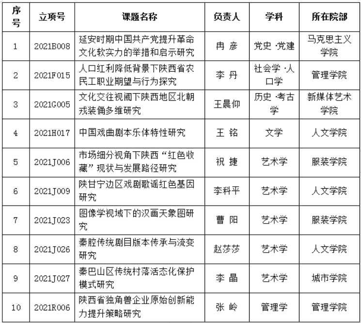 陕西省哲学社会科学工作办公室近日公布2021年陕西省社会科学基金年度项目(以下简称“省社科基金”)立项名单,全省共立项389项,我校获批10项,为我校历年来年度项目立项数之最。立项名单如下: