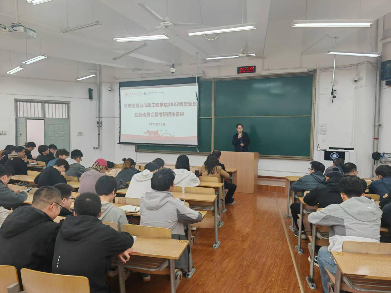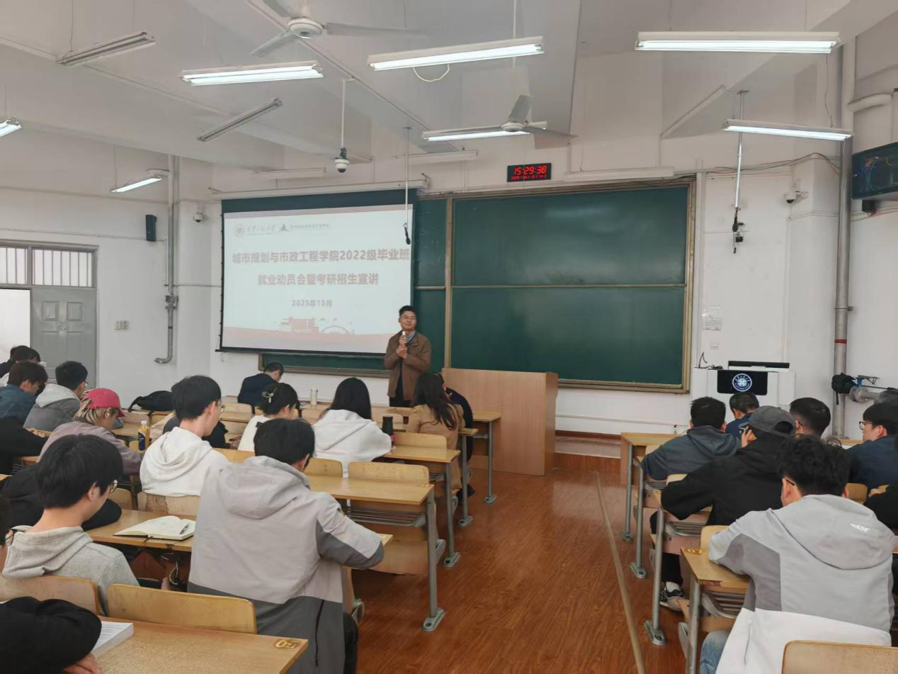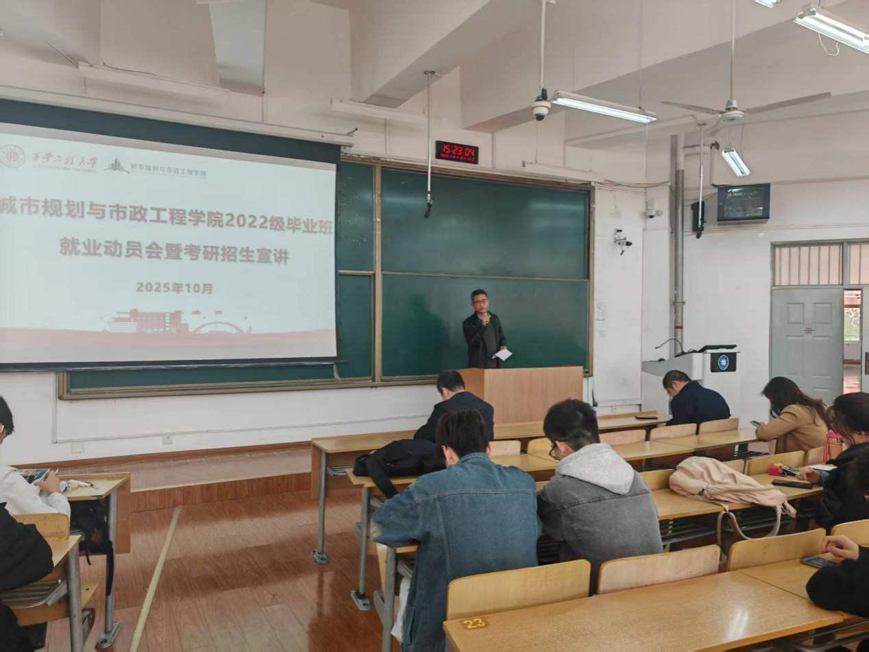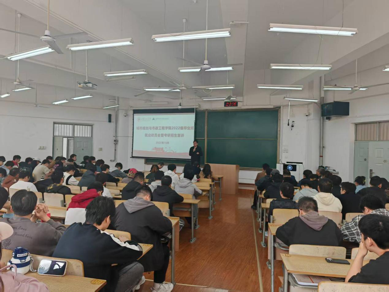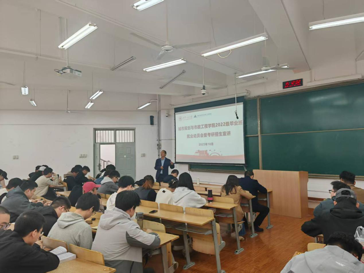 10月15日,城市规划与市政工程学院于临潼校区B座教学楼成功举办2026届毕业生就业动员会暨考研宣讲会。学院副院长(主持工作)房平、党委副书记鱼园、副院长杨涛,各系主任靳贵铭、崔心水、刘洋,学工办主任兼就业辅导员陆瑞成,毕业班辅导员杜倩以及全体2026届毕业生参加会议。