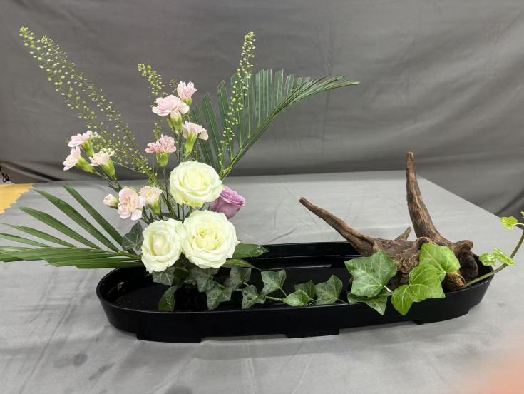 作为风景园林专业本科阶段的特色应用型课程,《盆景与插花艺术》打破了“理论+实践”的传统模式,构建起“基础夯实—技能精进—创新突破”的三阶教学体系。课程内容既涵盖盆景造型原理、插花色彩美学等核心理论,又深耕东方式插花的意境营造、西方式插花的规整构图、现代自由式插花的个性表达等实操技能,更结合风景园林专业特色,新增插花与城市公共空间、庭院景观的适配设计等拓展内容。教学中,郑君芝副教授不仅注重对剪、插、摆等基本功的精细化训练,更通过案例赏析、小组共创、作品互评等形式,引导学生打破思维定式,在传统花艺文化与现代设计理念的碰撞中,培养解决实际场景花艺需求的能力,全面提升艺术鉴赏力与创新创作力。