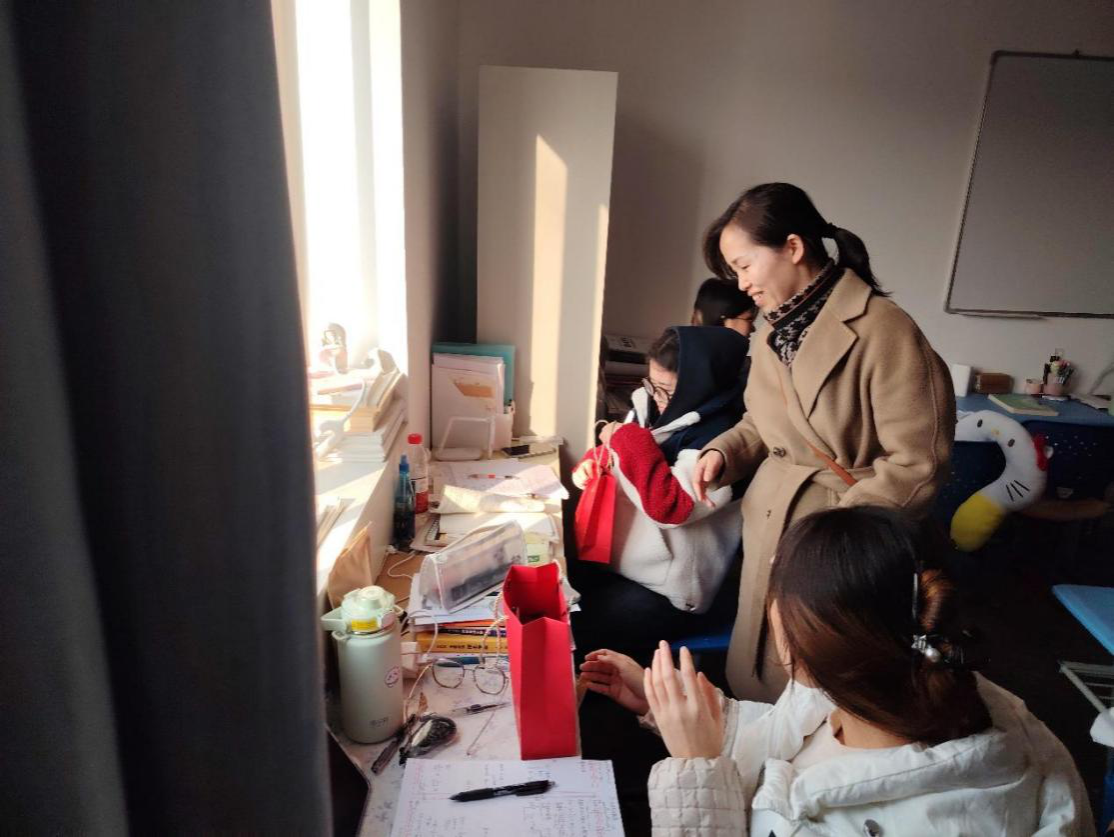 座谈会最后,学院领导向学生代表赠送精心准备的慰问品,并与全体参会人员合影留念。会议结束后,学院领导和辅导员到“一站式”学生社区共享自习室和学生宿舍慰问备考学生。