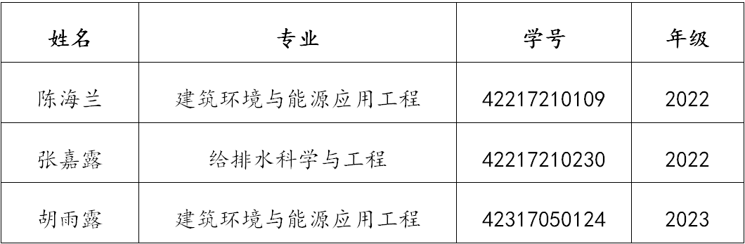 胡雨露,女,建筑环境与能源应用工程2302班,中共预备党员,综合测评成绩专业排名1/63,学习成绩专业排名2/63。