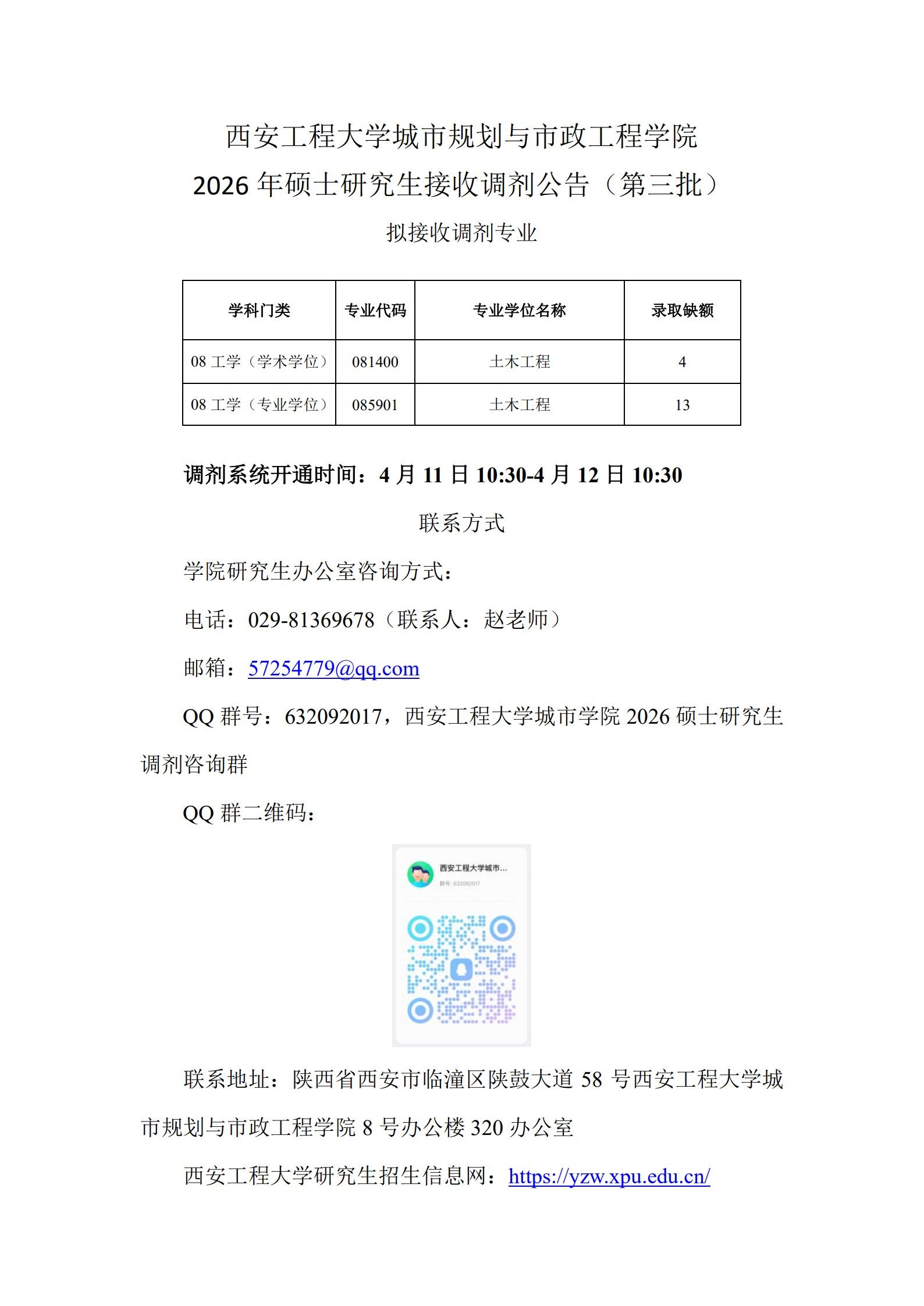 西安工程大学城市规划与市政工程学院2026年硕士研究生接收调剂公告(第三批)拟接收调剂专业