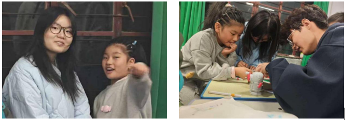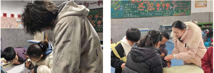与此同时,在另一间教室里,墨香四溢,惠晨津和屠晓璐带来的毛笔书法课同样吸引了众多孩子。两位“小老师”从最基本的执笔、坐姿教起,带领孩子们领略中华传统书法艺术的魅力。屠晓璐同学用生动有趣的故事讲解了汉字的起源和书法的历史,让孩子们对这门古老艺术有了初步的认识。惠晨津同学则穿梭于课桌之间,进行一对一的指导,手把手地帮助孩子们纠正握笔姿势,练习“横、竖、撇、捺”等基本笔画。孩子们聚精会神,在宣纸上认真临摹,虽然笔触尚显稚嫩,但每一笔都饱含着对传统文化的好奇与敬重。